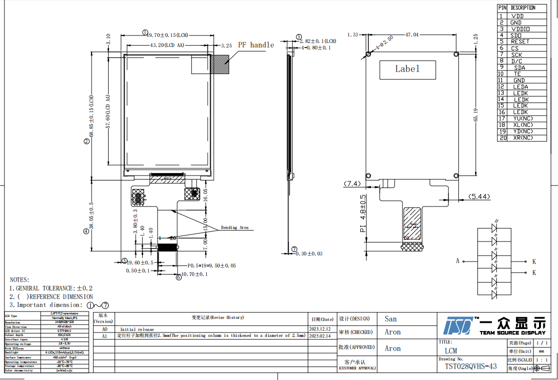 Este módulo de pantalla es un TFT (transistor de película fina) de matriz activa en color de tipo transmisivo. Pantalla de cristal líquido (LCD). Este módulo es compuesto por un módulo LCD TFT, un circuito controlador y una unidad de luz de fondo. La resolución de un 2.8 "contiene 320*240 puntos y el Área activa es 43,2 (ancho) x 57,6 (alto)